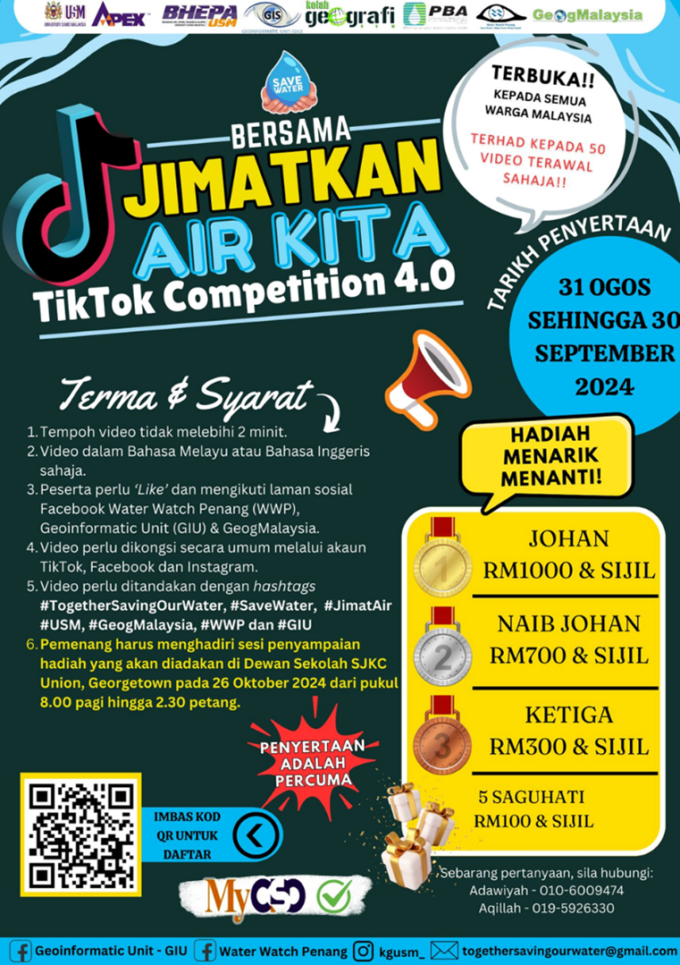In conjunction with Malaysia’s Independence Day celebration in 2024, the USM Geography Club, in collaboration with the GeoInformatic Unit (GIU), Water Watch Penang (WWP), and the Malaysian Geographical Society (GeogMalaysia), organized the TikTok Contest themed “Together Saving Our Water.” Sponsored by the Penang Water Supply Corporation (PBAPP), the contest encouraged creative public participation to raise awareness on water conservation through social media engagement.