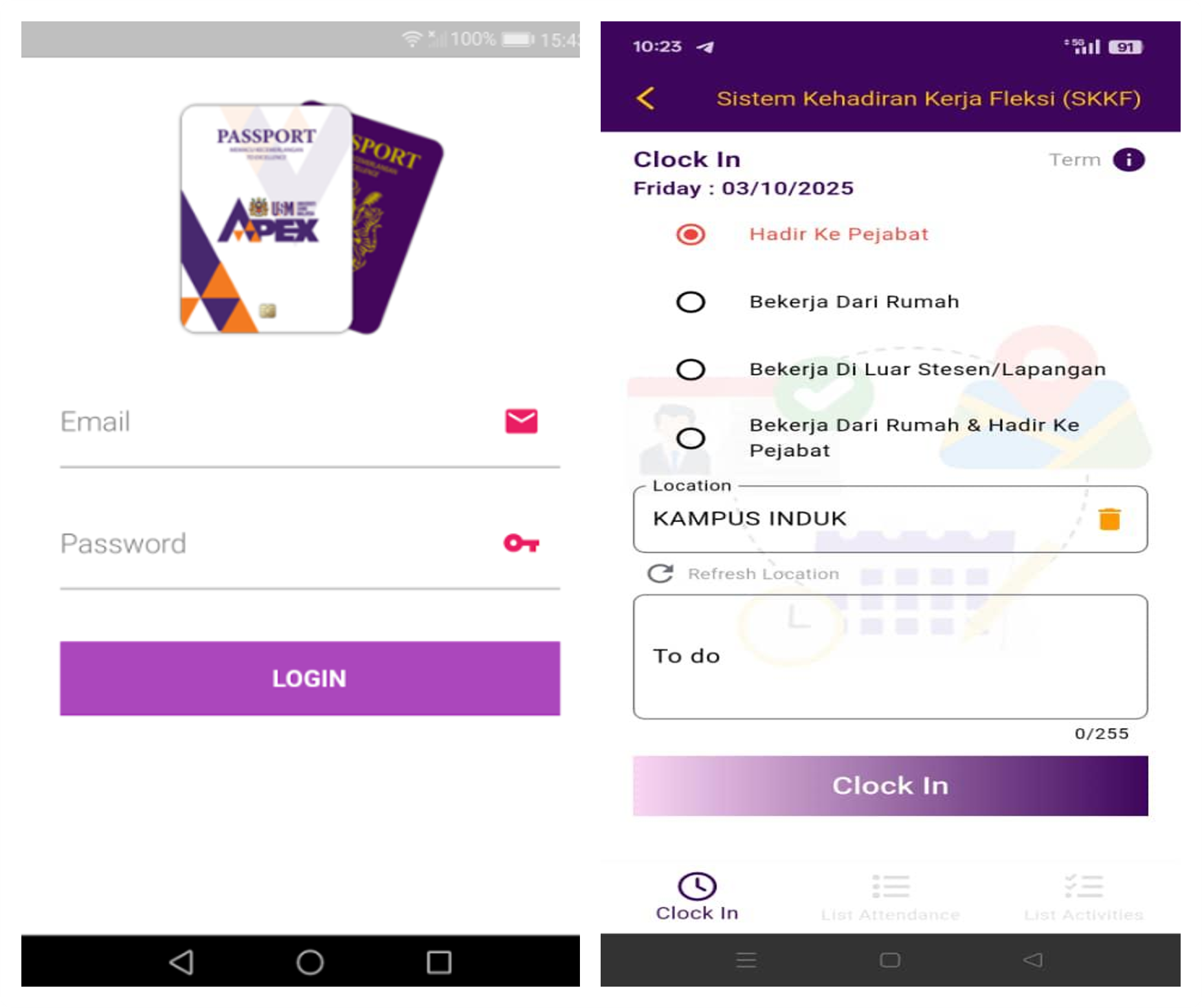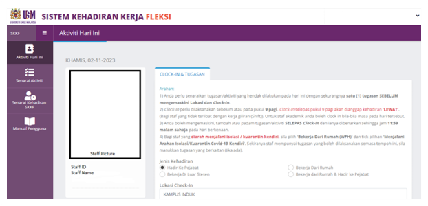 To support these arrangements, USM utilises the Sistem Kehadiran Kerja Fleksi (SKKF) via the Passport USM platform, where staff record attendance, indicate work modes such as on-site, Work From Home, outstation or hybrid, and document official tasks. Supervisors verify submissions digitally, ensuring accountability and performance monitoring while maintaining flexibility for employees.